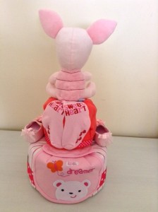 This 2-Tier Baby Girl Diaper Cake Baby Shower gift consists of: