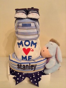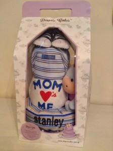 We received this Diaper Cake order all the way from Hong Kong. This handsome, striped 3-Tier Diaper Cake was delivered to mummy with a bottle of champagne too!