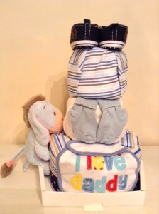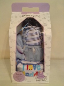 This 3-Tier Baby Boy Diaper Cake Gift Hamper consists of: