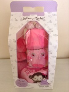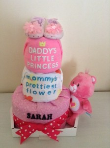 Here’s a pretty pink 3-Tier Diaper Cake for baby girl Sarah.
