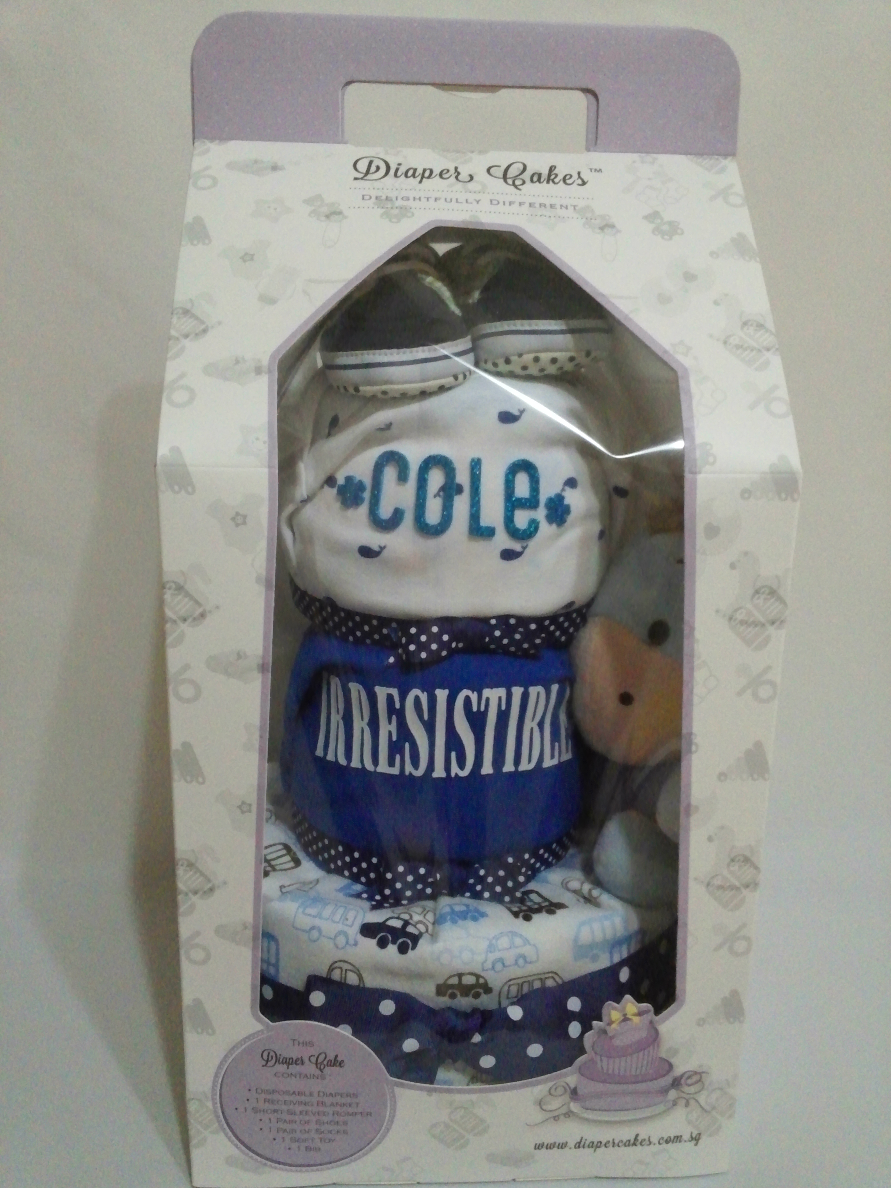 Customized with baby Miranda’s name and wrapped in our 46cm tall premium purple and white gift box. Unique, practical and very adorable!
