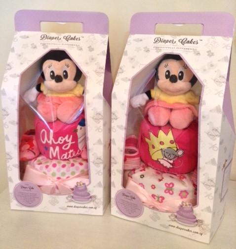 Available in both Mickey and Minnie Mouse designs, these cute little Diaper Cakes are all hand made with love, intricately wrapped in clear plastic gift wrapper, and finished with a little matching ribbon bow at the top.
