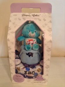 This 2-Tier Sing-A-Long Care Bear Diaper Cake was baked for Baby Zac.